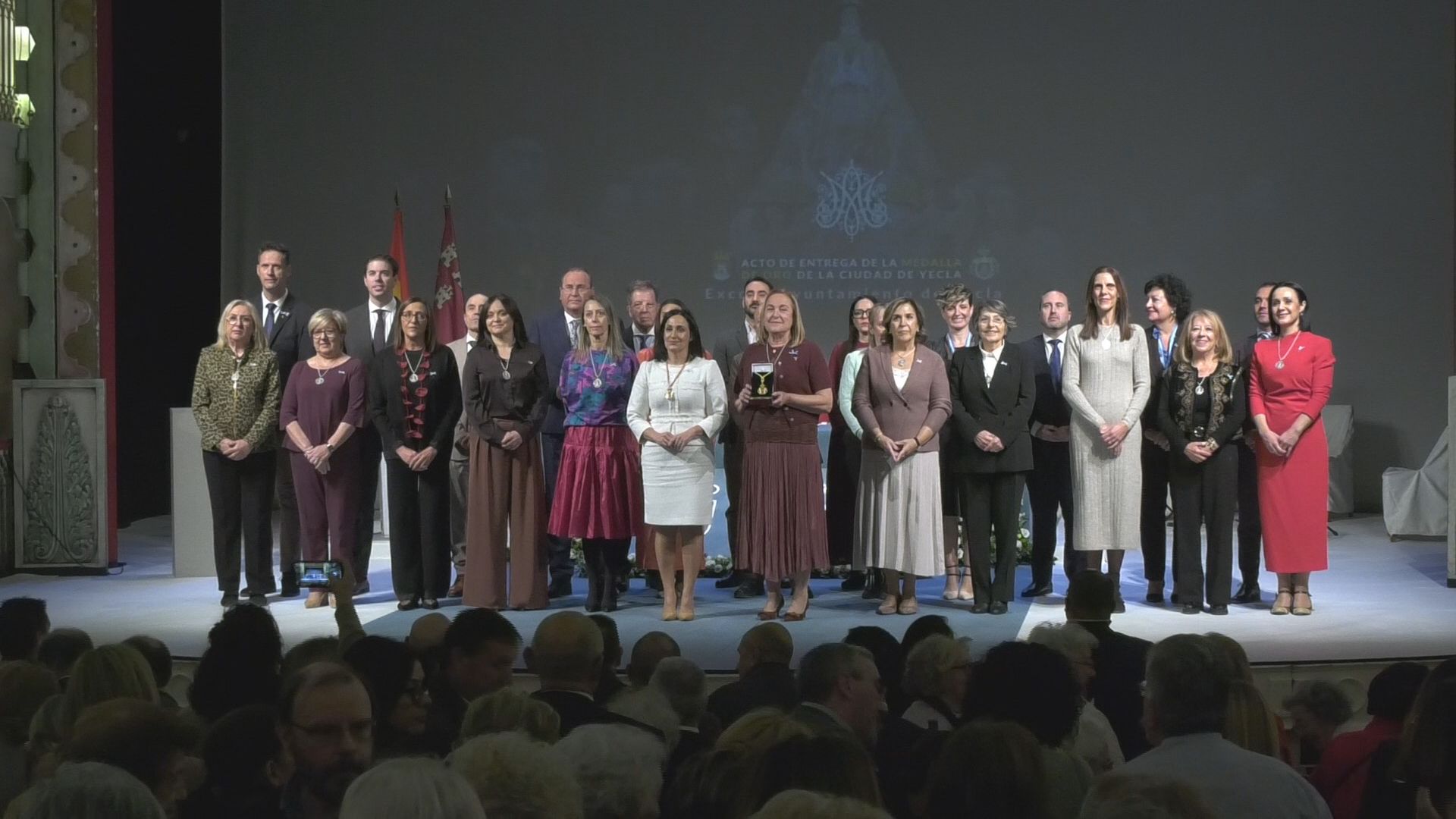 La Corte de Honor de la Purísima Concepción recibió este domingo la Medalla de Oro de la Ciudad de Yecla en un emotivo acto celebrado en el teatro Concha Segura, repleto de vecinos y socias que quisieron acompañar a la Corte de Honor en el 80º aniversario de su fundación.